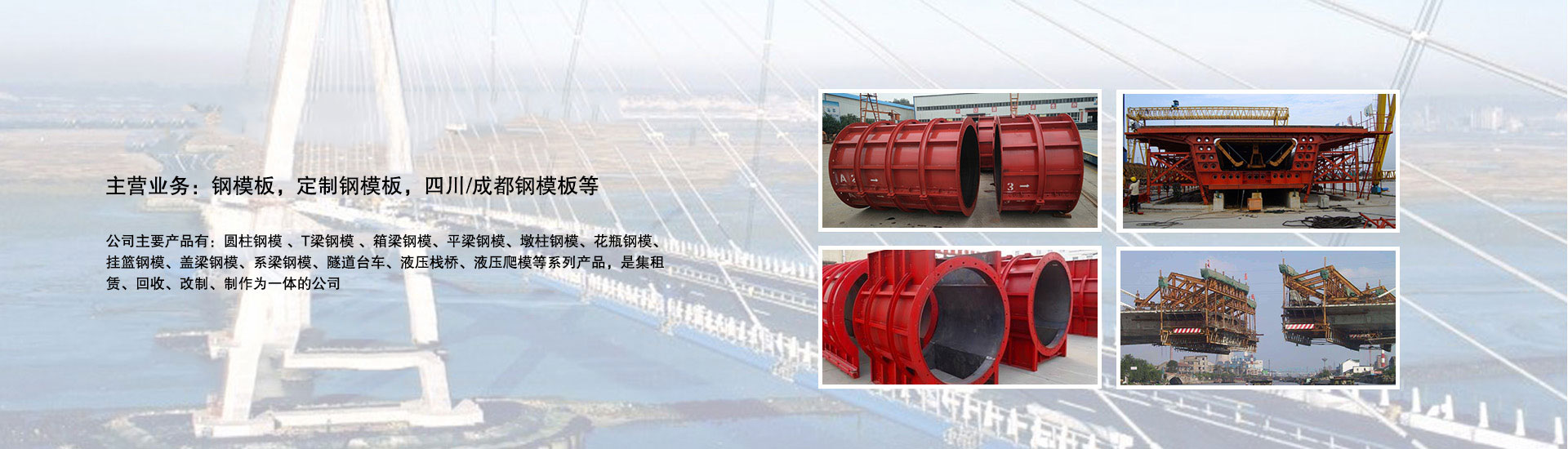 我公司主要產品有:圓柱鋼模 、T梁鋼模 、箱梁鋼模、平梁鋼模、墩柱鋼模、花瓶鋼模、掛籃鋼模、蓋梁鋼模、系梁鋼模、隧道臺車、液壓棧橋、液壓爬模等系列產品,是集租賃、回收、改制、制作為一體的公司。